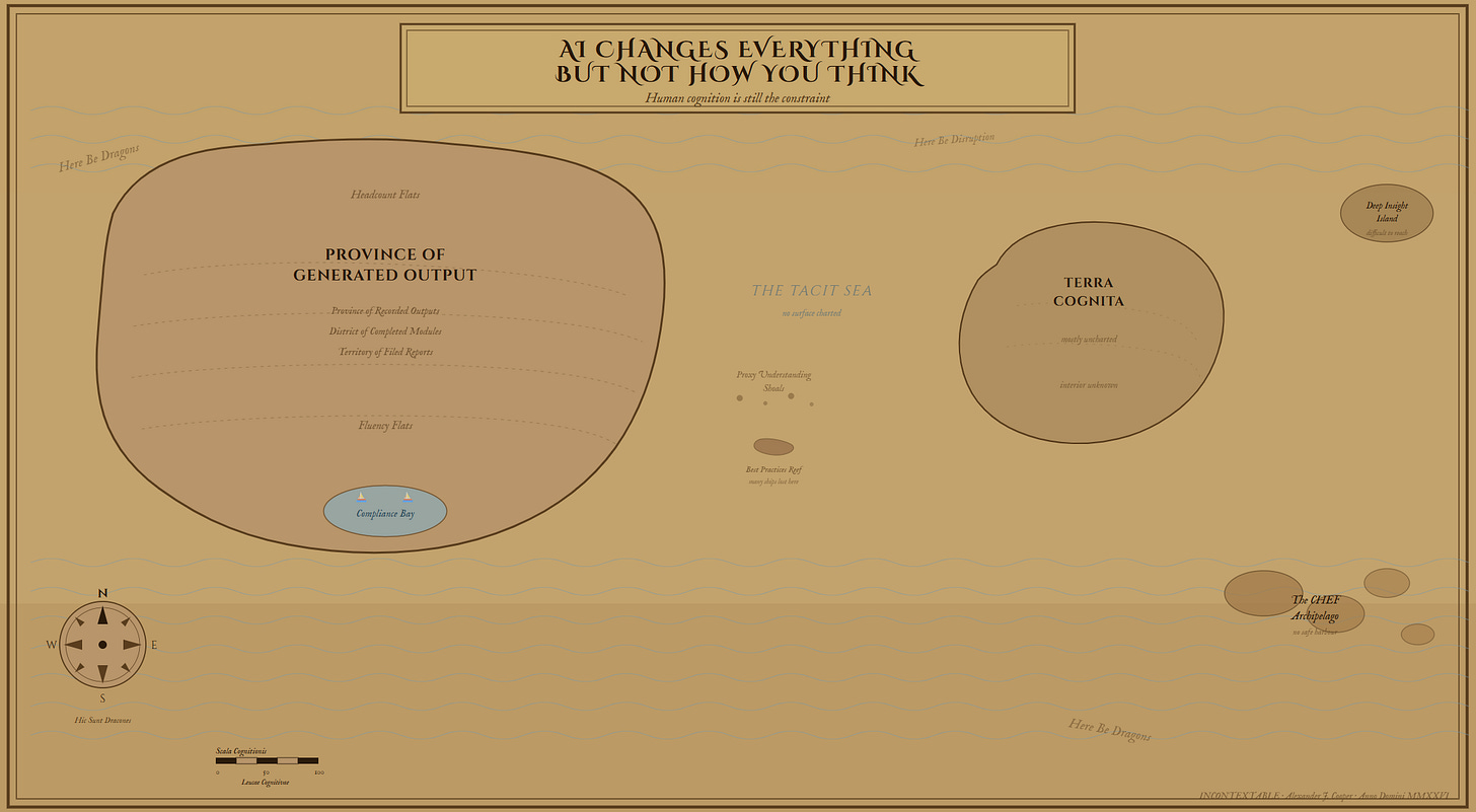 The industrial model wasn’t just a management technique. It was an explanation of what knowledge is, how it moves, and what it is for. Capture it. Codify it. Control it. That explanation made sense when information was scarce and coordination was expensive. It makes no sense now. And AI doesn’t update the explanation. It just runs it harder.