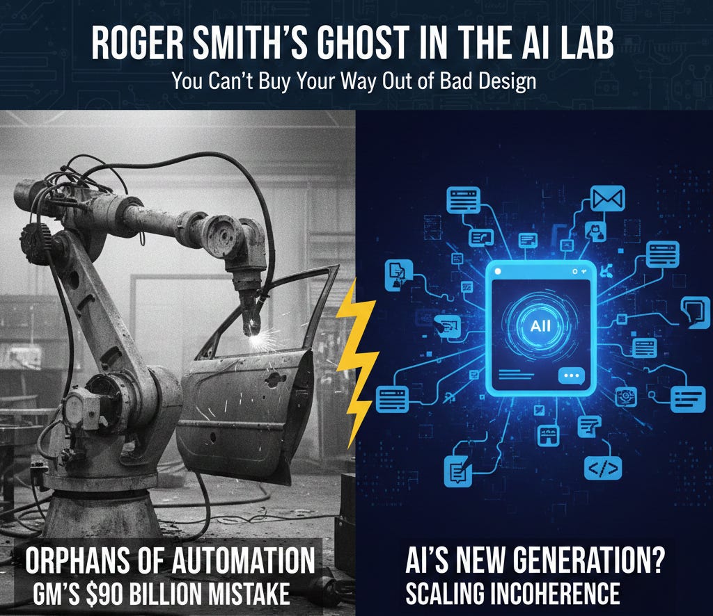 Roger Smith proved that you can’t buy your way out of a bad design. You can’t automate incoherence. Whether it’s a robot arm in 1985 or a Large Language Model in 2026, if the information is siloed, the tool is an orphan.